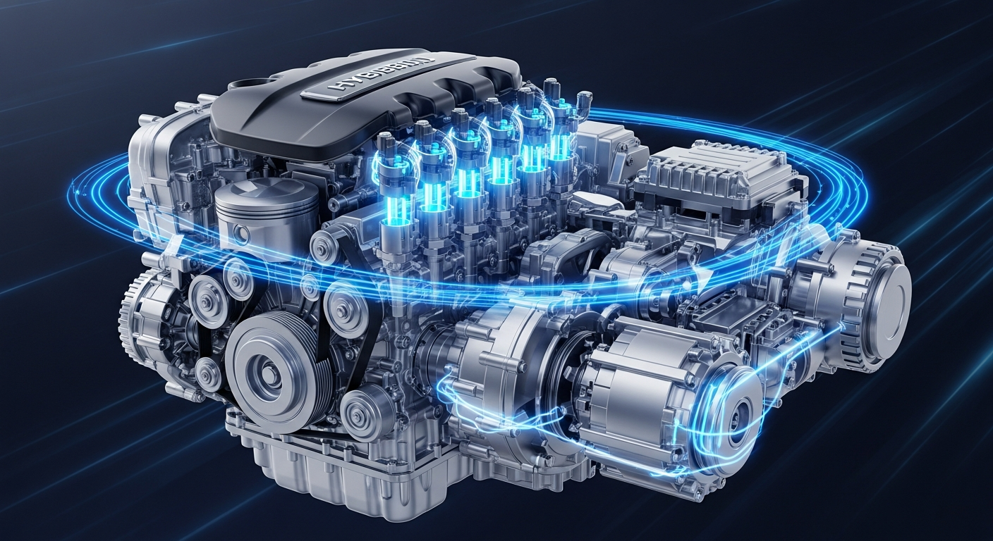 BlueCore Super Engine není jen motor — je součástí komplexního hybridního systému iDE-H s konfigurací P1+P3. Elektrická složka zahrnuje: