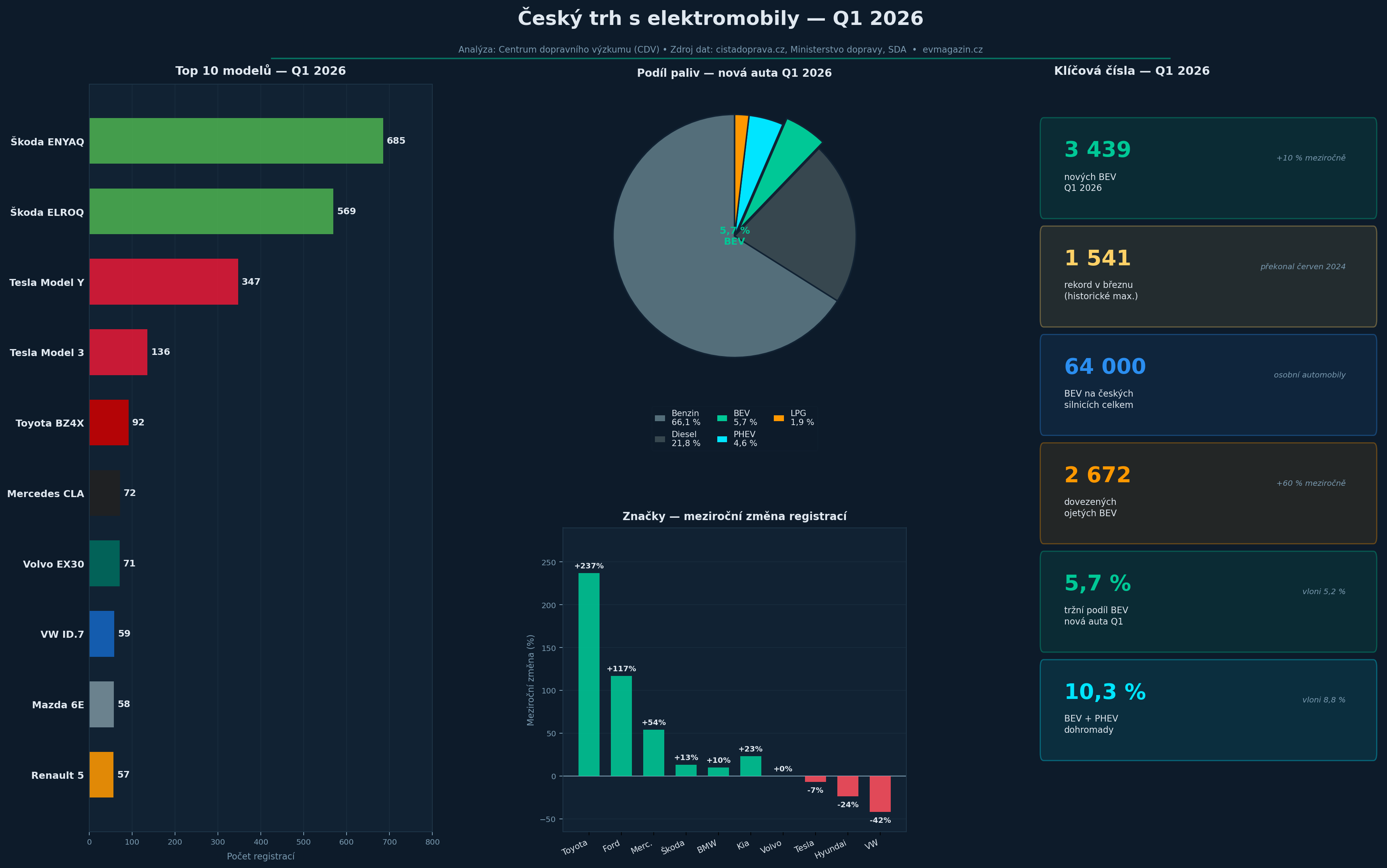 V období od ledna do března 2026 bylo v Česku zaregistrováno celkem 3 439 nových osobních bateriových elektromobilů (BEV), což představuje meziroční nárůst o 10 %. Sám o sobě by to byl solidní výsledek — jenže pravou tečkou za čtvrtletím byl březen.