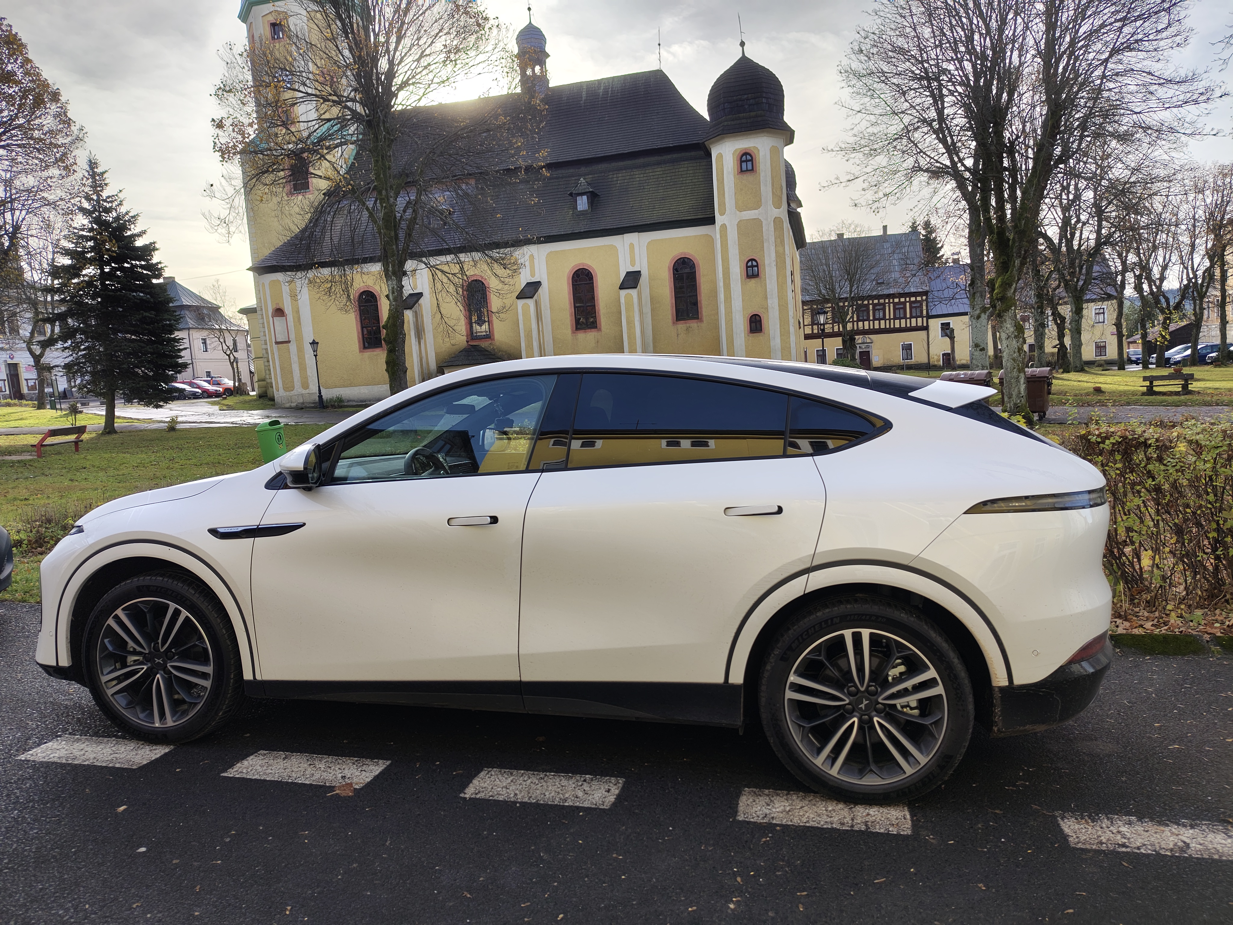 Pokud jde o konkrétní spotřebu: cesta z Prahy k Božímu Daru vykázala 22 kWh/100 km – pršelo, bylo chladno (okolo 10 °C i méně) a drželi jsme rychlost do 130 km/h, nejčastěji okolo 120 km/h. Cesta zpět byla příznivější s 20 kWh/100 km. Vůz tedy předvádí podobné hodnoty jako například Škoda Enyaq. Pokud jde o Teslu Model Y, ta by dle našeho odhadu ukázala o něco lepší hodnoty.